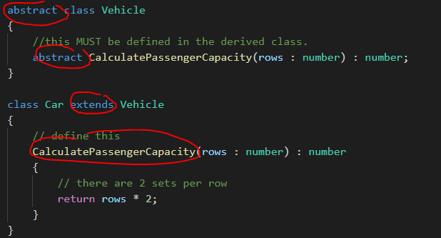 Abstract members (function and properties) must be defined in the derived classes and not in the abstract class. They are just sketched out.