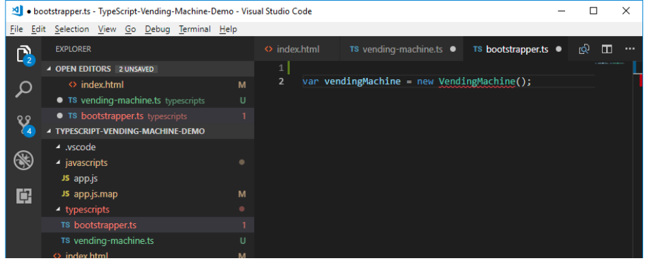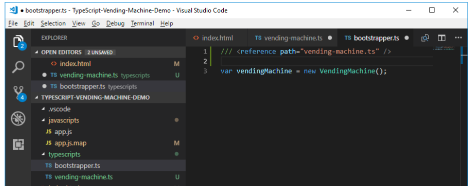 Look at the example below. VendingMachine Class is declared in a vending-machine.ts. Bootstrapper.ts is trying to instantiate the VendingMachine class but has not idea what that Type is. It needs a reference to that other file (much like a using statement in .NET) so it can have access to those libraries.