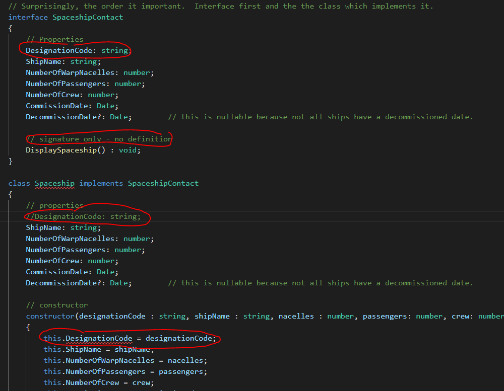 This example shows us how to use an Interface to define and require the shape of a used class. Notice that if I try to use this class and not define one of it's required properties, it throws an error.